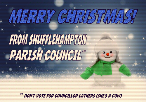 Councillor Watterson reminded everyone that Christmas was a season of peace and goodwill to all men, and more recently women and children. In this vein it was important to extend a cheerful message to the people of Shufflehampton, even though the Council clearly disliked each other in private with some relationships having descended into bitter, pathological hatred. Councillor Lathers seconded this, saying she absolutely loved Christmas but detested Councillor Watterson, wanting nothing more than to yank his boxer shorts vigorously in an upwards direction so that his eyes would water for 4-6 weeks.