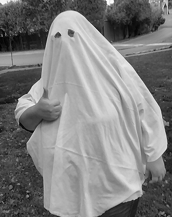 ‘For pity’s sake, Gary!’ Richard snapped, jerking so violently he almost knocked his bonce into a dustbin. ‘We know that’s not possible! When a dead person becomes a ghost, they’re destined to always wear the clothes they died in. You were killed by a moving tractor, while running across the road, pretending to be a ghost. You were wearing that sheet over your head at the time, so now you’re spending eternity as a real ghost who looks like a pretend ghost. These are the facts, Gary.’